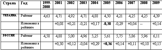 Также следует отметить значительное изменение российского рейтинга в конце 2003 года – +0,29 балла по сравнению с концом 2002 года (приведенное в таблице в графе "2004"), связанное с деятельностью Путина и Ко на парламентских и президентских выборах в 2003-2004. Так, изменение рейтинга отразило рост ограничений политических прав граждан России.