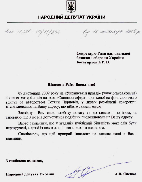 Так вийшло, що редакція отримала копію листа, який Яценко надіслав секретарю РНБО Раїсі Богатирьовій 10 листопада. В цьому листі депутат-бютівець стверджує, що більшість його слів в попередній публікації "Свиняча афера ДПА" були "перекручені, а деякі є вигадкою та наклепом".