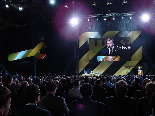 Для партійного дебюту було обрано виставковий центр на Лівобережній, стіни якого оформили тканиною темно–зеленого та чорного кольорів, що стали символом весняної депресії Яценюка.