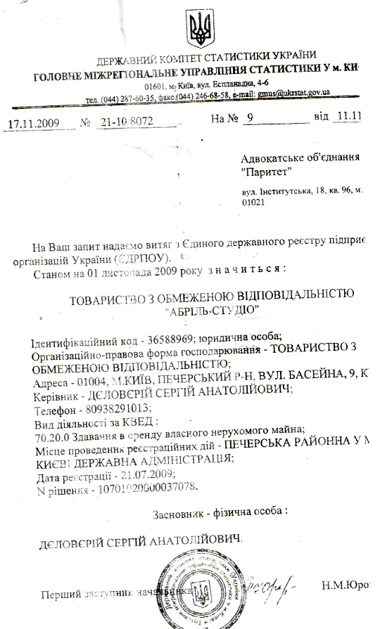 Не знайшовши "Абріль-студіо" за місцем реєстрації, я зателефонував за вказаним телефоном. Слухавку взяла дівчина, яка сказала, що не знає хто такий Сергій Анатолійович Дєловєрій (ім'я зазначене в довідці, як засновник "Абріль-студіо"). Коли я розповів їй, звідки в мене номер, дівчина "змінила покази": "А-а-а, тоді вибачте. Сергія Анатолійовича зараз немає, залиште свої дані і він Вам ввечері зателефонує".