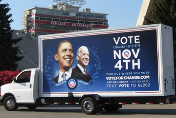 Що ж до прямої реклами на вулиці, то штаб використав свої бюджети найбільш оптимально. Було орендовано 50 брендмобілів, які об'їхали усі ключові міста США. На них було класичне політичне повідомлення, класичні гасла; через транслятори відбувалася агітація. Також брендмобілі були оснащені проекторами, які дозволяли в вечірній час переносити зображення (відео) на стіну будь-якої величини і агітувати.