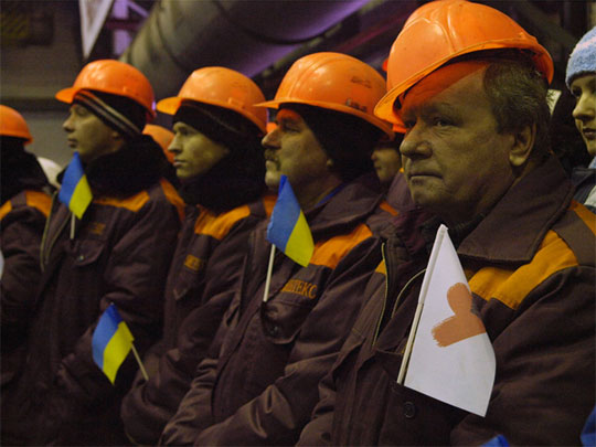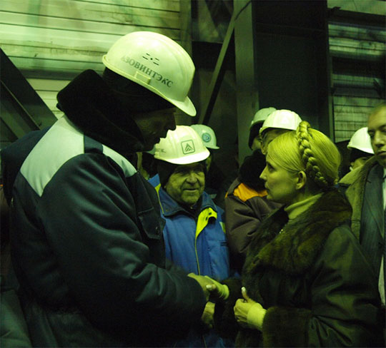 Алчевск - вотчина нынешних соратников премьер-министра - Виталия Гайдука и Сергея Таруты. Последний лично встретил кандидата в президенты у ворот комбината и, взяв ее под руки, подвел к коллективу. Оранжевые каски, бело-красные флажки, а главное - огромный транспарант "Энергетики и строители приветствуют премьер-министра Украины Юлию Владимировну Тимошенко!" вдохновили гостью на пышную благодарную речь.