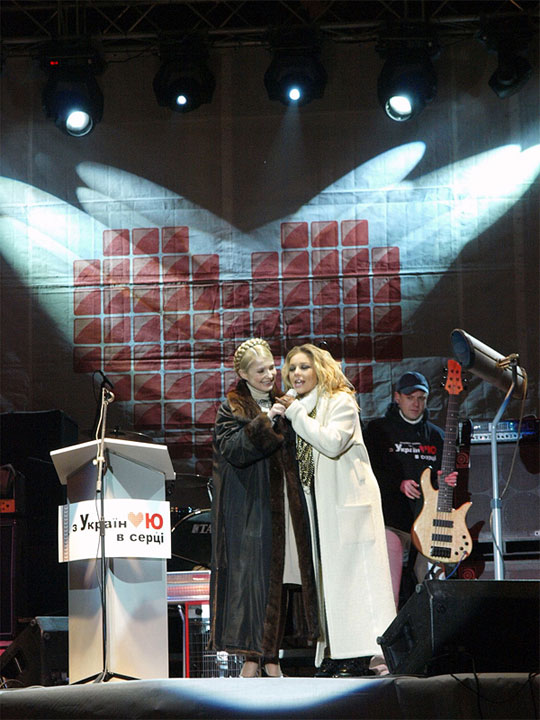 Толпа взревела, а Тимошенко передала микрофон Тине Кароль и в сопровождении ГАИ уехала в Луганск, где ее ждал еще один концерт "С Украиной в сердце". В эту ночь центральная площадь Луганска встречала Потапа и Настю Каменских плакатами "Северодонецк за Юлю!".