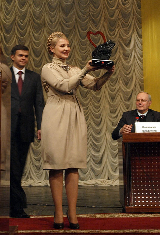 Тимошенко расчувствовалась. Сама вышла к авторитетам региона, пожала им руки, а в ответ получила в подарок местный "сувенир" - огромный кусок черного блестящего угля, обрамленного красным сердцем...