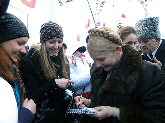 На этом "рабочая" часть мероприятия закончилась и началась предвыборная. Выступление кандидата проходило на открытом воздухе. Двенадцатиградусный мороз на асфальте в открытой степи не очень располагает к длинным речам. Юлия Тимошенко набросала лишь фрагменты своего выступления, главные тезисы которого в этот день повторились еще три раза, но уже в более полном варианте.