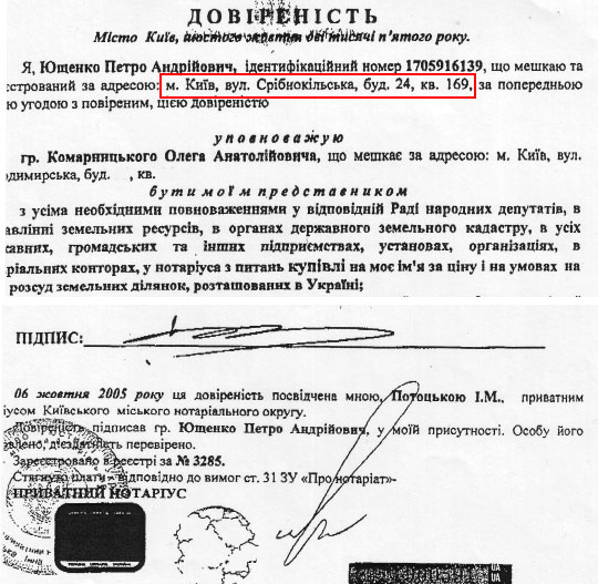 | Довіреність Петра Ющенка на придбання земельних ділянок |