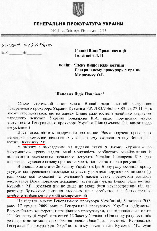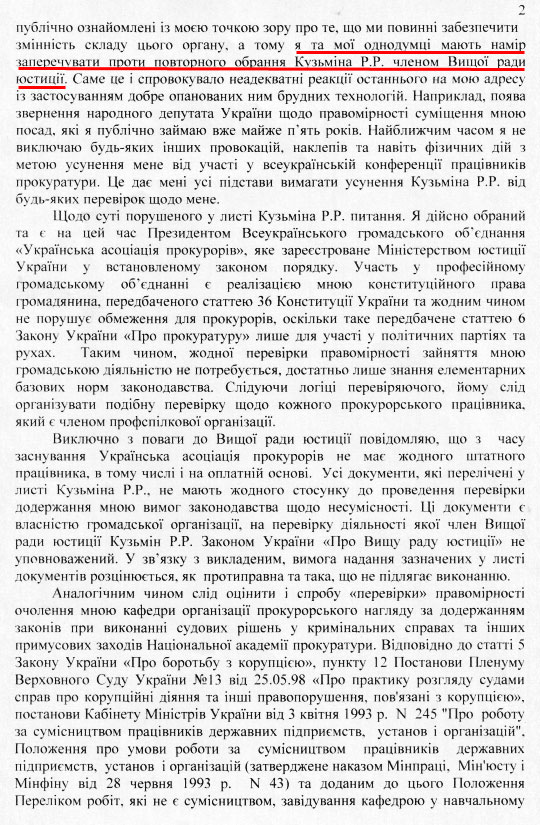 А вже 26 листопада я отримую запит від Кузьміна як від члена Вищої ради юстиції. Він пише, що Вища рада юстиції отримала звернення від народного депутата Бондарьова щодо порушення мною законодавства про несумісництво. Тобто що я незаконно обіймаю посаду заступника генпрокурора і президента "Асоціації прокурорів України" та незаконно завідую кафедрою в Національній академії прокуратури.