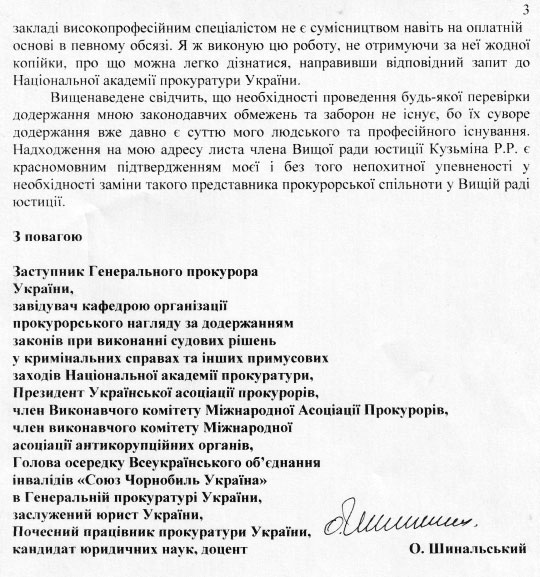 Увагу до своєї персони Шинальський пояснює тим, що став конкурентом для іншого заступника генпрокурора Рената Кузьміна в боротьбі за членство у Вищій раді юстиції – конституційному органі, покликаному вершити долю суддівського корпусу України.