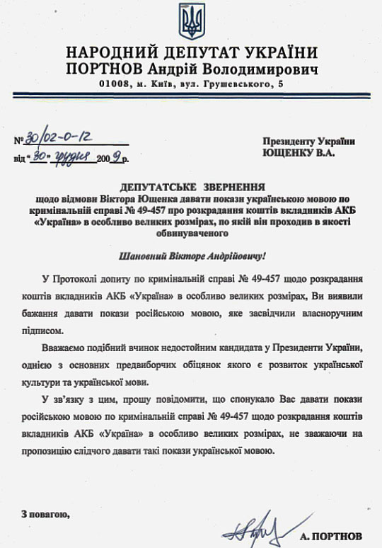 Іронічно-цинічний стиль депутата особливо прослідковується в іншому запиті на ім'я президента - він просить від Ющенка пояснень щодо... мови, якою той давав свідчення. Хоча як юрист Портнов не міг не знати - коли слідчий не володіє українською мовою, він сам просить свідка зголоситися на свідчення російською.