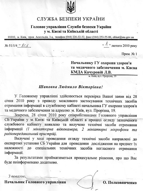 "...28 января 2010 года сотрудниками Главного управления СБУ в Киеве и Киевской области в ходе осмотра служебного кабинета обнаружены и изъяты технические средства получения информации (1 миниатюрная видеокамера, 2 миниатюрных микрофона и радиопередающее устройство)".