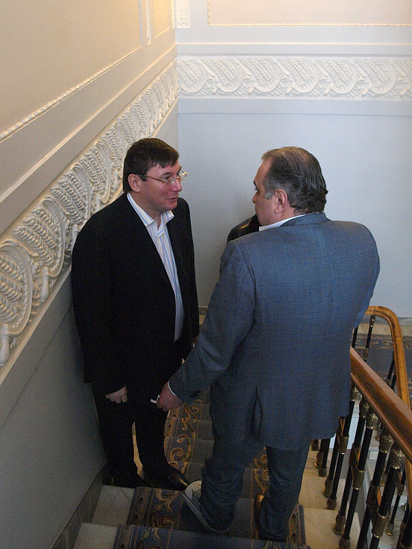Ближе к обеду Давид Жвания, поломавший не так давно ногу, медленно спускался со второго этажа, собираясь покинуть стены парламента. В это время Юрий Луценко заходил в Раду и направлялся на заседание группы "Народная самооборона". Экс-партнеры встретились прямо на лестнице. Места было немного, и они остановились вплотную друг к другу.