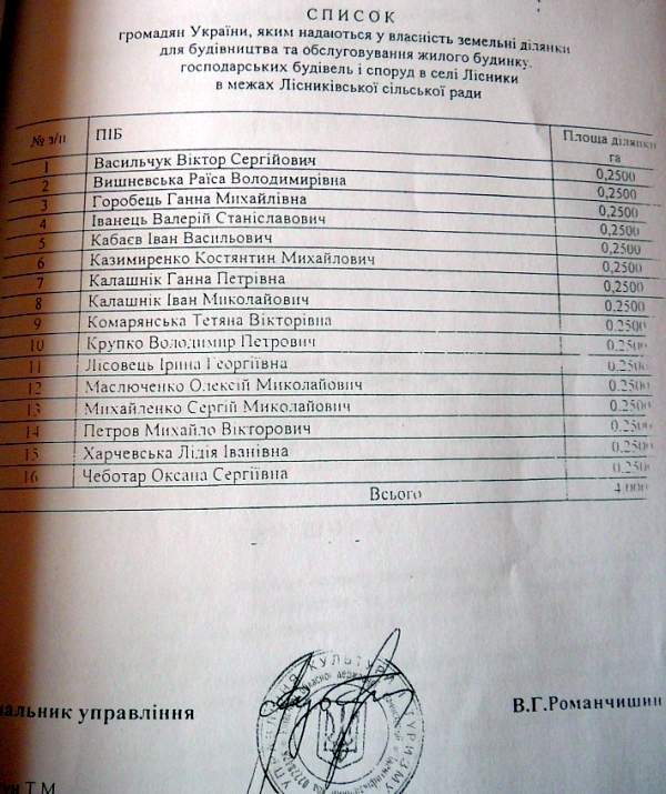 Ці 16 щасливчиків отримали землю від держави безкоштовно, хоча одна сотка в селі Лісники коштує 10 – 15 тисяч доларів.