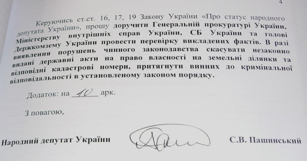 І тут відбувається найсмішніше. Сергій Чеботар не придумав нічого кращого, ніж написати голові Державного комітету України з земельних ресурсів Олегу Кулінічу офіційного листа з проханням повернути компрометуючий його документик зі звернення Пашинського.