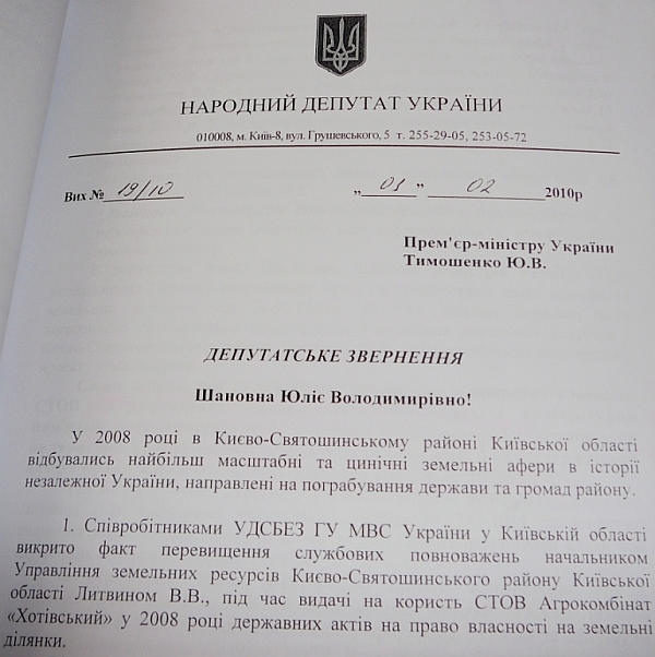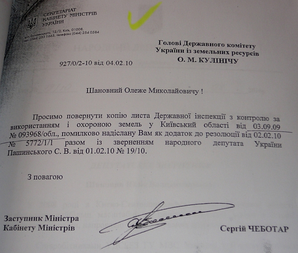 Лист потрапив в службу прем’єр-міністра. Там звісно, ніхто його прискіпливо не вивчав. Отож Юлія Володимирівна видала резолюцію направити запит свого депутата Пашинського для перевірки до керівника Держкомзему Олега Кулініча, керівника ГУБОЗ Володимира Бедриківського та заступника міністра Кабінету Міністрів Сергію Чеботарю.