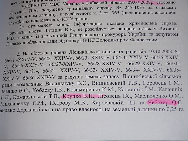 В даному випадку, сумнівні державні акти агрокомбінату підписав представник "Нашої України" близький до Петра Порошенка. Мова йде про начальника управління земельних ресурсів Києво-Святошинського району Вадима Литвина.