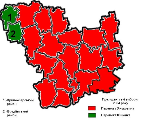 Кривоозерський та Врадіївський райони у 2004 році політично перейшли до проукраїнської частини вперше і у відсотковому плані "невпевнено".