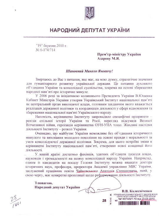 Підставою для цього став лист депутата-регіонала Вадима Колесніченка, відомого своєю проросійською позицією. Депутат звернувся до прем'єр-міністра Миколи Азарова з вимогою змінити керівництво Інституту національної пам'яті, оскільки те начебто працює на розкол України.