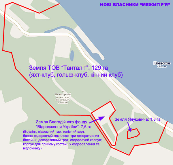 Фірма "Танталіт" (тобто фізичні особи, які ховаються за маклером з Відня і юристом з Ліхтенштейну) офіційно декларує, що збирається побудувати на своїх 129 гектарах "Межигір'я" так званий "Центр відпочинку і здоров'я" - яхт-клуб, гольф-клуб і кінний клуб.