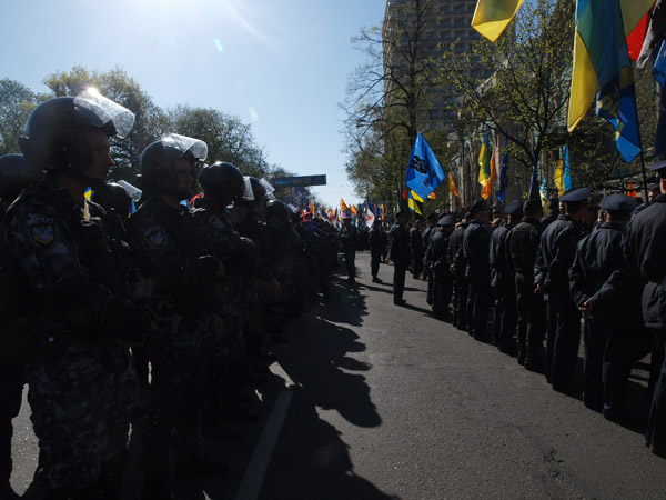 В той же час очі кидалась повна некерованість натовпу протестантів. Відсутність епіцентру акції протесту значно ускладнювала і роботу правоохоронців. Вони кидались з одного краю натовпу до іншого, намагаючись перешкодити мітингувальникам прохід до стін парламенту. Втім зранку невеличкій групі активістів з символікою організації "Тризуб" ім. Степана Бандери таки вдалося дістатися прихильників Партії регіонів.