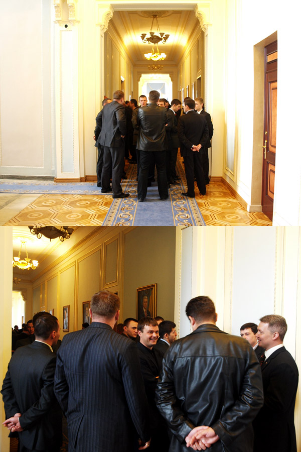 Втім регіонали теж непогано підготувались до історичного засідання. Коридор, що веде від кабінету спікера до президії, повністю заблокували невідомі люди в цивільному. Зранку декілька десятків молодих людей потрапили до будівлі парламенту через службовий вхід для керівництва Ради, де їм роздавали посвідчення помічників народних депутатів. Згодом цю групу замінили інші люди - теж в цивільному.
