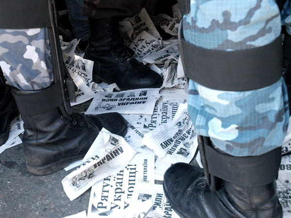 З криками "Героям Слава! Смерть ворогам!" вони пробились крізь кордон міліції і рознесли одну з синіх палаток.