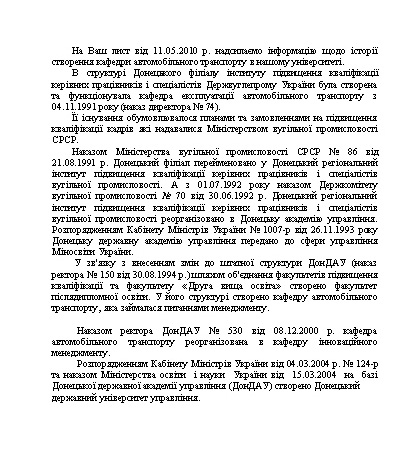 На сайті Донецького державного університету управління інформація про таку кафедру відсутня. "Менеджмент", "Економіка"... Ось чим займається виш. Звідки ж тут може бути "автомобільний транспорт"?