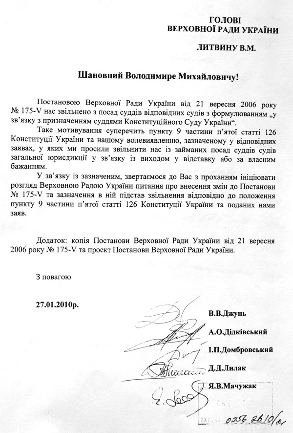 27 січня 2010 року - в період між першим та другим туром президентських виборів, коли фаворит перегонів вже майже був визначений - п'ятеро з шести членів КС, призначених з'їздом суддів, написали Володимиру Литвину фатальний лист з проханням все ж таки змінити формулювання підстав їх звільнення з попереднього місця роботи.