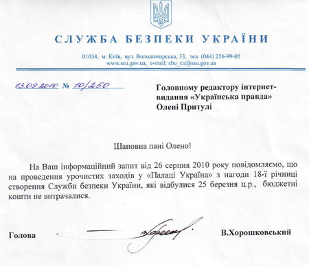 "Повідомляємо, що на проведення урочистих заходів у Палаці Україна з нагоди 18-ої річниці створення Служби безпеки України, які відбулися 25 березня ц.р., бюджетні кошти не витрачалися".
