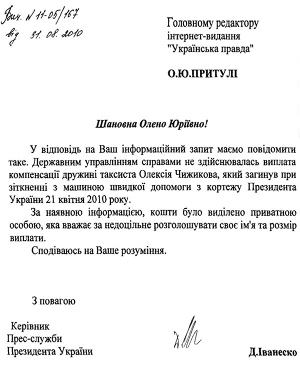 "Державним управлінням справ не здійснювалась виплата компенсації дружині таксиста Олексія Чижикова", - йдеться у відповіді адміністрації на запит "Української правди".