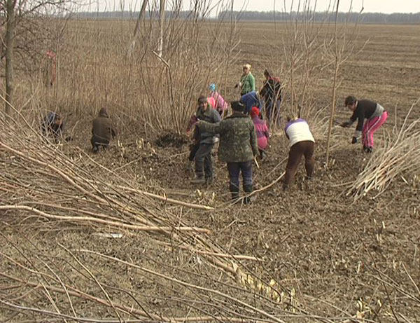 На узбіччі біля села Пугачівка бригада людей із сокирами працює зранку до вечора за 40 гривень щодня.