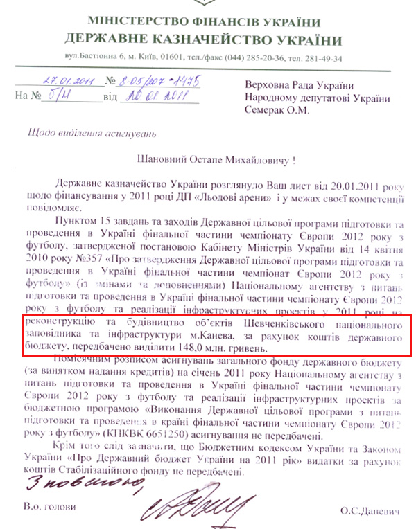 В рамках реалізації цього завдання і з урахуванням того, що Шевченківський національний заповідник є національним надбанням України, здійснюється реконструкція і будівництво його об’єктів та інфраструктури м. Канева як національного туристичного маршруту за напрямком руху учасників та вболівальників, які відвідають Україну під час проведення фінальної частини чемпіонату Європи з футболу", - йдеться в листі Халаджі.
