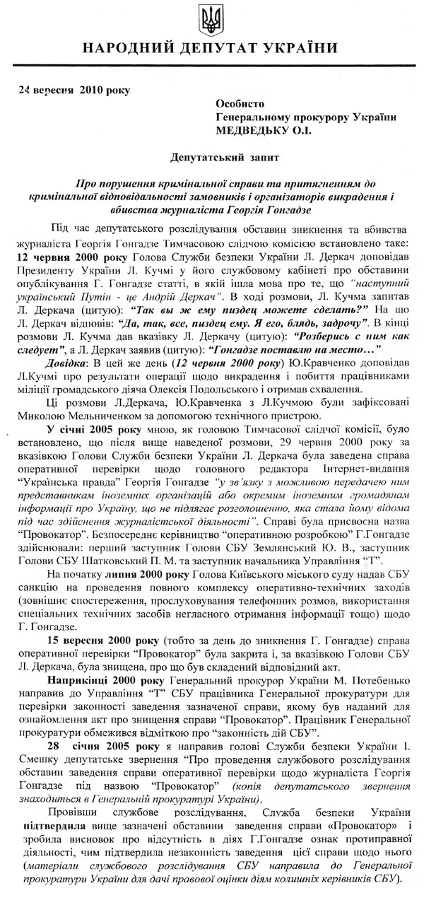 Інформація про це міститься в депутатському запиті колишнього голови слідчої комісії в справі Гонгадзе Григорія Омельченка до генпрокурора Олександра Медведька: