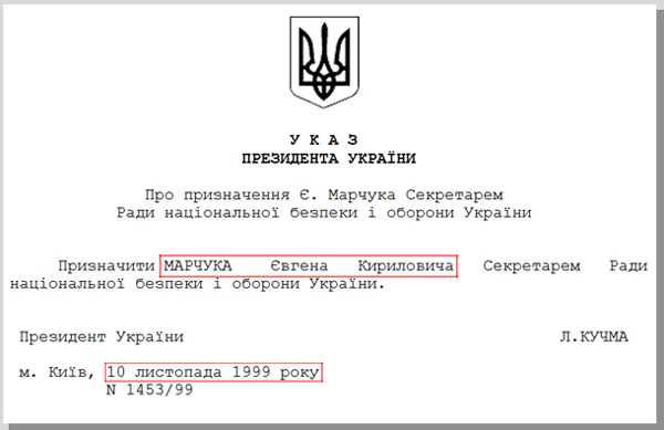 Но уже ко второму туру президентских выборов Евгений Марчук пришел совсем другим человеком. 10 ноября, за четыре дня до второго тура в том самом кабинете, где, по словам автора статьи, отдавались преступные приказы, был подписан указ Леонида Кучмы о назначении Евгения Марчука секретарем СНБО Украины.