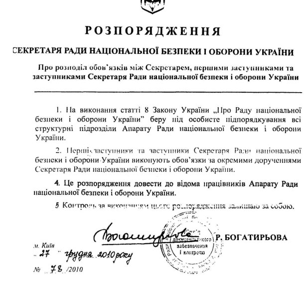 Цьому наказу Богатирьова надала гриф "таємно", після чого її перший заступник Степан Гавриш, який є державним експертом з питань таємниць в апараті Радбезу... своїм приписом скасував гриф Богатирьової.