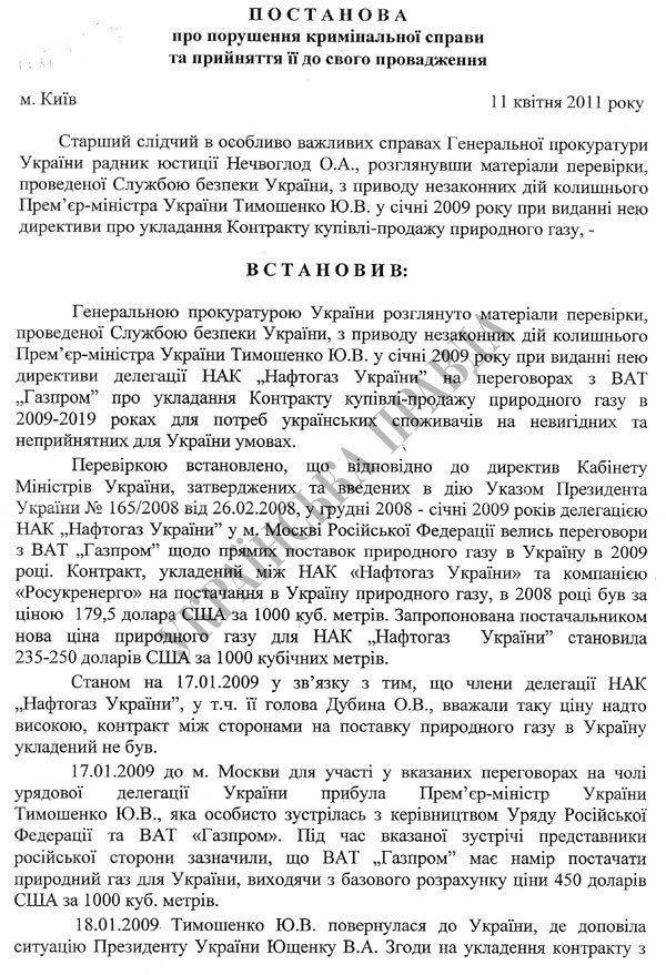 У розпорядженні Української правди є сам текст постанови про порушення справи проти Тимошенко щодо газових договорів з Росією.