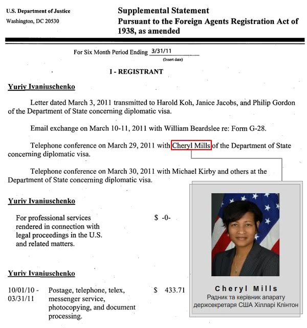 Зрештою, питанням опального регіонала займалась і радник та керівник апарату Гіларі Клінтон Шеріл Мілз.