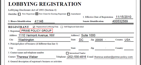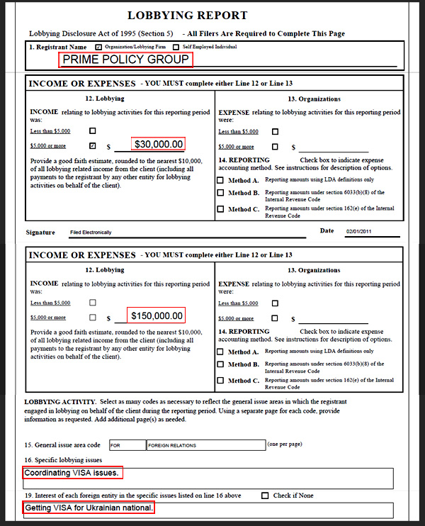 А вже 15 листопада 2010 року в базі даних Управління державних архівів Конгресу США з’явився запис про реєстрацію нового клієнта однієї з лобістських компаній Вашингтона. В реєстраційних документах метою лобіювання було позначено "Coordinating VISA issues".