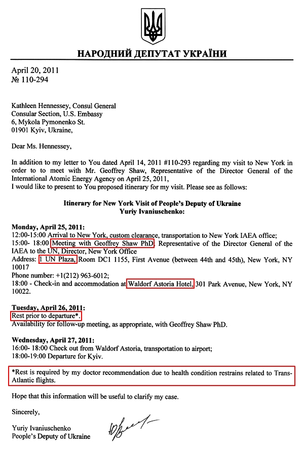 У перших рядках листа Юрій Іванющенко сам пояснює, що віза необхідна йому для відвідування офісу МАГАТЕ в Нью-Йорку.