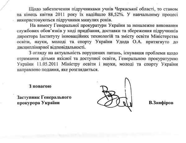Згідно з листом заступника генпрокурора Віктора Занфірова, у Міністерстві освіти не забезпечено належне виконання повноважень щодо випуску підручників та посібників для школярів.