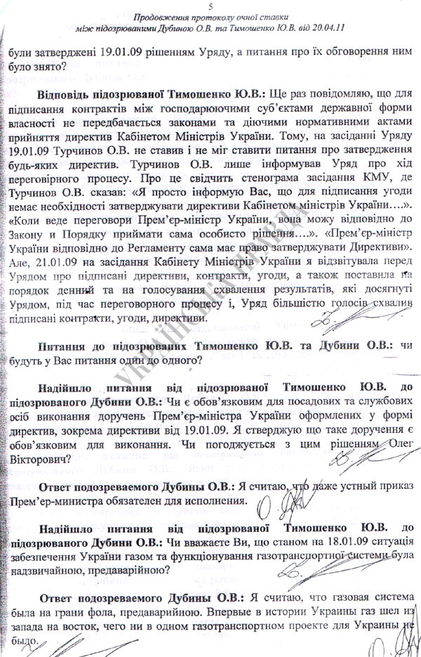 Ці його слова відрізняються від сказаного ним в ході допиту 3 лютого 2011 року. Тоді Дубина зізнався, що за жодних умов не підписував би угоду з "Газпромом", якби довідався, що передані йому письмові директиви Юлії Тимошенко не були затверджені Кабміном.