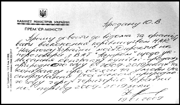 Тим не менш, у разі, якби це доручення було залучене як доказ, воно ламало би всю справу - адже тоді Тимошенко не перевищувала би владу, надаючи директиви Дубині. Виглядало би, що вона в межах своїх повноважень передала їх своєму підлеглому міністру Продану. А Продан уже передав їх Дубині, на що мав право - адже саме Міністерство палива та енергетики управляє 100% акцій "Нафтогазу".
