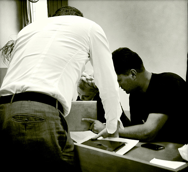 У дорадчу кімнату Родіон Кірєєв виходив під гучне скандування БЮТівців "Ганьба!". А Юлія Тимошенко так і залишилась сидіти на лаві підсудних. До неї тут же ж підбігли найближчі соратники. Кожен з них намагався дати якісь поради. Вони нагинались над вухом лідера, щось шепотіли, потім стрімко кудись вибігали, а їхнє місце займав наступний бажаючий.
