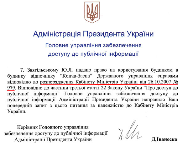 Будинок відпочинку "Конча Заспа" відмовився надати договір на реконструкцію, пояснюючи, що "запитувані документи містять конфіденційну інформації та персональні дані про фізичну особу. Будинок відпочинку "Конча Заспа" Державного управління справами не має правових підстав поширювати зазначену в запиті інформацію".