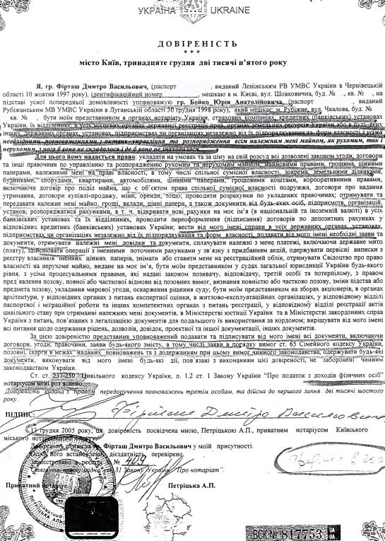 Довіреність була виписана Юрію Бойку для представництва інтересів Дмитра Фірташа у шлюбному процесі з Мариною Каліновською у 2006 році. Задля об’єктивності треба зазначити, що документ діяв в той час, коли Юрій Бойко не займав державних посад.
