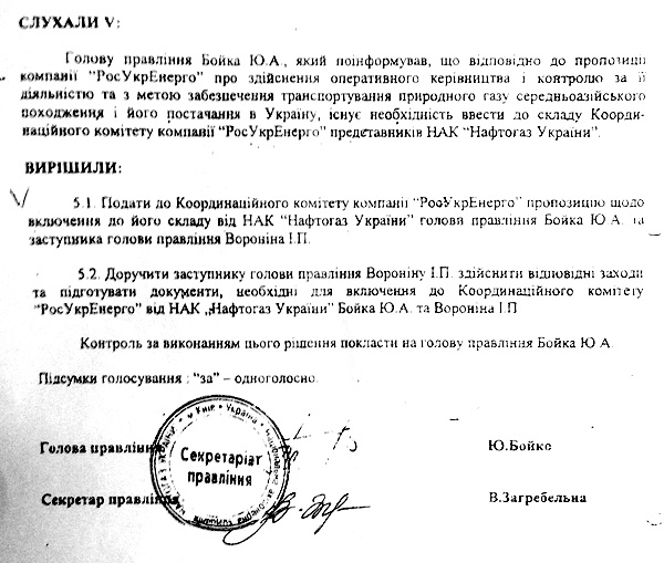 Дійсно, п’ять років тому в ефірі телеканалу "1+1" Юлія Тимошенко вже демонструвала Юрієві Бойку зазначений документ. Це - протокол установчих зборів компанії RosUkrEnergo та створення координаційного комітету з управління компанією.