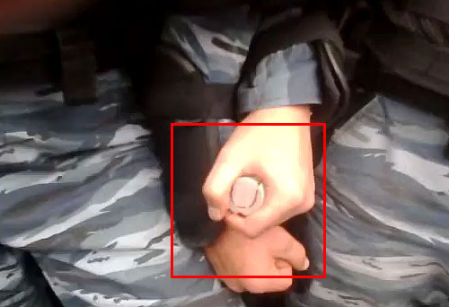 На цьому відео можна помітити, як співробітник "Беркуту" ховає газовий балон, який побачили у нього в руках.