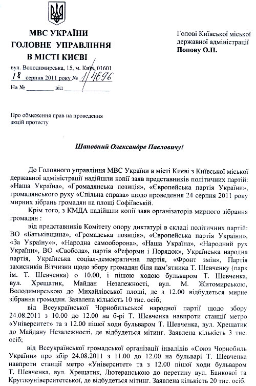 Так, за тиждень до свята, 18 серпня начальник київської міліції Олексій Крикун звернувся до намісника Януковича в столиці Олександра Попова з листом "про обмеження прав на проведення акцій протесту".