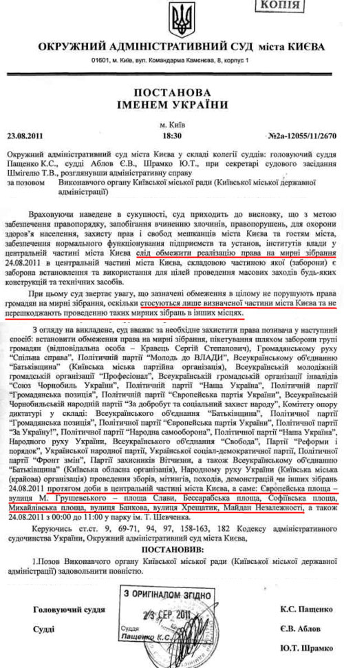 Водночас тут же в своєму рішенні суд робить обмовку: "Зазначені обмеження не порушують права громадян на мирні зібрання, оскільки стосуються лише визначеної частини міста Києва і не перешкоджають проведенню таких мирних зібрань в інших місцях".