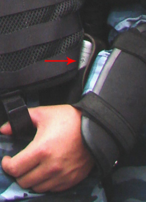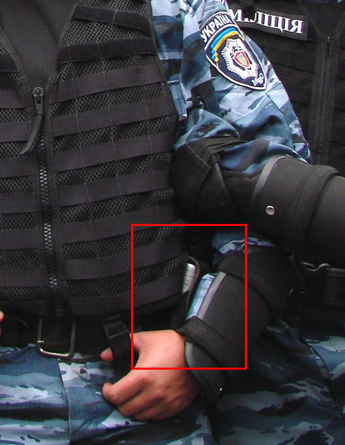 Отже, на зображенні чітко видно, що співробітник "Беркуту", який перекриває вулицю Володимирську, укомплектований балончиком сльозоточивого газу "Кобра".