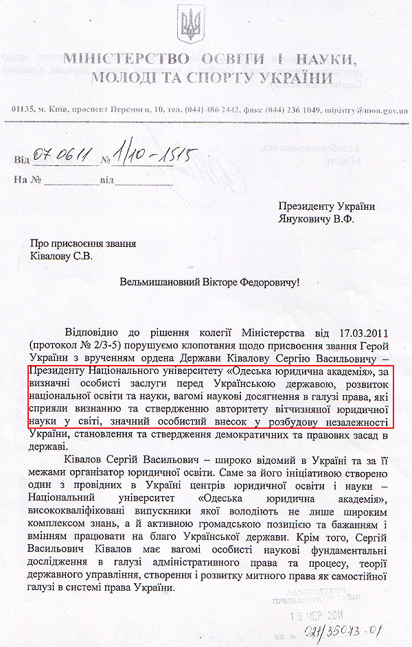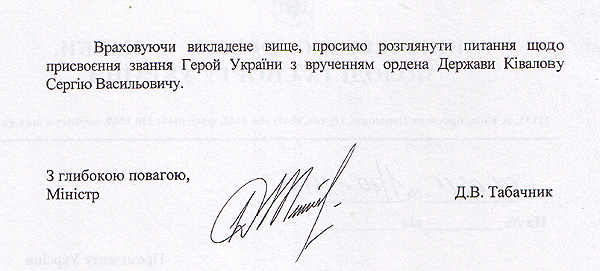 Наступний лист направило Міносвіти 7 червня. Посилаючись на рішення колегії Міністерства від 17 березня, міністр Дмитро Табачник також просив присвоїти Сергію Ківалову звання Героя.